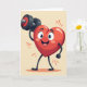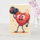 This card features an anthropomorphic red heart centered on a pale beige background, lifting a black-and-red dumbbell straight overhead like it’s showing off for someone special 🥰. Its glossy crimson body has crisp outlines, wide sparkling eyes, and an open smile that feels like a flirty grin aimed right at the viewer ❤️. Soft rosy blush on its cheeks adds a tender, affectionate touch, as if it’s enjoying the attention while it works out. Short orange dash marks radiate around the heart to show motion and bursts of energy, making the pose look lively and confident. The dumbbell’s darker plates and cool gray bar add contrast against the warm reds, with a small metallic shine along the center. Any text sits near the top in a simple red font, leaving the heart and dumbbell as the main focus. The scene stays minimal and uncluttered, with lots of open space that keeps your eyes on the heart’s expression and the lifted weight. The background remains a smooth, uniform beige with the orange dash accents floating around the heart’s sides.