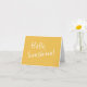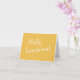 A yellow note card with the words "hello sunshine" printed on it in white.