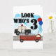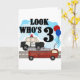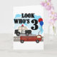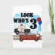 Um cruzador da polícia, motor de incêndio, balões e texto que diz "Olha quem tem 3" aparece nos nossos camisetas de aniversário de 3 anos do Heroes do Dia a Dia, canecas, cartões, adesivos, botões de aniversário e muito mais.