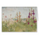 © Cheri Blum/Apple selvagem. Hollyhocks pelo mar, junto com a grama verde. Um céu azul pode ser visto no fundo.
