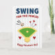 This greeting card mixes baseball and Valentine’s Day in a sweet, easy way ❤️💌. The background is white with light vertical pinstripes, like a baseball uniform. In the center there’s a baseball diamond with a green field and yellow infield shapes. A baseball with red stitching is shown flying past the diamond, with black motion lines that make it look like it was just hit. Red hearts are scattered around the field, with three hearts rising up from the outfield and one heart sitting near home plate. Near the top, the text says “SWING” in navy blue block letters, and below it “FOR THE FENCES” in red letters that slant a bit. At the bottom, “Happy Valentine’s Day!” appears in red, tying the whole design together like a fun note with a box of chocolates 🍫.