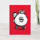O cartão perfeito para enviar dinheiro ou doações para amigos, familiares, crianças, instituições de caridade e mais, este simples design retrô apresenta uma ilustração estilizada de um homem carregando uma grande bolsa de dinheiro e um fundo vermelho vibrante. O cartão é intencionalmente deixado em branco por dentro para que você escreva seu cumprimento ou texto à mão, ou você pode optar por editar o interior e adicionar texto digitalmente. Há muitas maneiras de usar este cartão, você vai querer encomendar vários para ter à mão para aqueles momentos em que deseja enviar dinheiro.