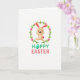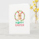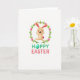Designed with a fresh spring look, this card features a smiling long-eared bunny in soft light-brown tones, with rosy cheeks and an open, friendly expression 🐰. The bunny is shown mid-leap with arms and legs stretched wide, like it’s bounding toward someone it’s happy to see. Around the bunny sits a round wreath of green vines and small leaves, dotted with pastel pink egg shapes that feel like gentle little gifts tucked into the greenery 🌷. A small fluffy pink tail peeks out to one side, adding a sweet accent that pairs nicely with the rosy details on the face. Below the illustration, the text “HOPPY EASTER” is centered, with “HOPPY” in bright teal and the “O” replaced by a matching teal egg. The word “EASTER” appears right after in coral pink, echoing the pink eggs in the wreath. The background stays plain white, making the wreath’s greens, the bunny’s warm browns, and the teal-and-coral lettering stand out clearly.