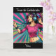 Um cartão de aniversário fofo para um adolescente ou uma garota de vinte e poucos anos. Vamos comemora-te! Estilo de banda desenhada bonita dama com fones de ouvido ouvindo música com um fundo de pop.
