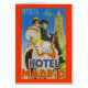 poster de viagens vintage para o Hotel Madrid, Sevila mostrando um casal flamenco tradicional contra a aranha catedral.