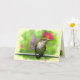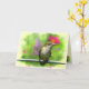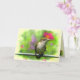 This note card features a young ruby-throated hummingbird. He has not yet developed the ruby coloration on his throat. He is sitting on a metal bar, ready to dive into the nectar from the flowers surrounding him. The background is a soft, lovely palette of pink, red, gold, yellow and green. More hummingbirds are inside.