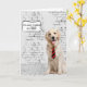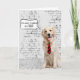 Ouro recuperador com bolha de fala, gravata riscada vermelha e preta, no tijolo por envelhecer.
