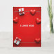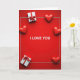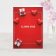 This greeting card features a solid red background that instantly feels romantic. In the center, the words “I LOVE YOU” appear in white, simple sans-serif lettering, standing out clearly against the red. A thin white border frames the card, and parts of it overlap slightly with the decorations to add a bit of depth. In each corner sits a glossy red heart that looks slightly raised, with light reflections that make it feel shiny and real. Two white gift boxes with red ribbon bows are placed on opposite corners, like little surprises waiting to be opened. The strong contrast of red and white keeps the focus on love while still feeling warm and easy to take in. It’s a meaningful card to give because it says exactly what you feel, and the hearts and gifts add a gentle sense of care 🥰❤️. Hope it helps you share your Valentine’s Day sentiments with someone special.