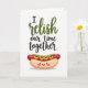 This greeting card pairs a sweet food joke with a warm message about spending time together. At the top, it says “I relish our time together,” with “relish” written larger in olive-green script and the rest in smaller black lettering. Below the text is a cute hot dog character sitting on a plain white background. The sausage is red and tucked into a golden bun, topped with a bright yellow mustard line and a green relish swirl. The hot dog has small black eyes and soft pink cheeks, giving it a happy, content look. The simple layout keeps your focus on the pun and the friendly character, making it feel romantic in a light, easy way. It’s a fun choice for a partner or a close friend, and the colors make the message pop without feeling busy ❤️