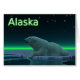 A peaceful moment in the long Arctic night. A Polar Bear rests at the edge of an open area in the pack ice. The Northern Lights glow in the distance; bright stars twinkle overhead. Text reading "Alaska" also appears in glowing green and white. Polar bears are endangered. How much longer will scenes like this be able to occur? Please help save Polar Bears from extinction.