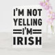 This card features a high-contrast black-and-white layout with the phrase “I’M NOT YELLING I’M IRISH” centered in large, uppercase sans‑serif letters across four stacked lines. The white background stays open and airy, letting the heavy black type feel like it’s leaning in close, the way a friend might grin and nudge you during a lively toast 💚. Each letter has a worn, speckled texture, with tiny white flecks breaking up the black ink like a well-loved print that’s been passed around. Two thick horizontal bars sit on either side of “I’M” on the third line, like a pair of arms bracketing the word in a confident, teasing embrace ☘️. The text is set dead center, with even spacing between lines that keeps the message tightly grouped and easy to read. There are no characters or scenery, but the stacked wording and gritty texture create the sense of a cheeky back-and-forth between close friends. The final look is stark and graphic, with solid black letters and distressed speckles standing out sharply on a plain white field.
