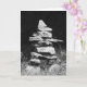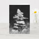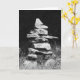 A striking black and white photograph of a rock inukshuk, used as a directional marker in historic times but now commonly seen on roadsides and in parks.