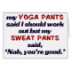 minhas CALÇAS da IOGA disseram que eu devo elaborar mas minhas CALÇAS de SUOR disseram, ` Nah, você são boas.' Se a roupa poderia falar para nós então este é o que diriam. Eu supor que você poderia decidir o que você quer sua roupa dizer sobre você. Se seu as pessoas de Walmart ou do palácio da ioga isto são a guerra que é lutada continuamente entre a pele apertada e o delicado e confortável. Talvez, se você era esclarecido você poderia escutar ambos; obtenha que maravilhoso elabore e sente então para trás em suas calças de suor macias e saiba que tudo que que espaça você pôr lá era devido a seu trabalho duro.