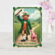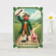 This card shows a cheerful Irish figure, leprechaun-like, striding down a sunlit dirt path with a raised staff and a wide grin that feels like it’s meant for a close friend 💚. He wears an emerald long coat over an orange waistcoat with shiny gold buttons, and a cream top hat topped with a small shamrock ☘️. Beside him, a plump rosy-pink pig trots along on a leash, glancing up with a calm, trusting look that adds a sweet note of companionship. The path curves into rolling green hills, with soft shadows leading the eye toward a bright sky dotted with pale clouds. An ornate border wraps the scene, decorated with shamrocks that echo the green landscape and frame the pair like a little keepsake. Along the bottom, the phrase “Dear Old Ireland!” sits centered in a contrasting, easy-to-read color against the lighter ground beneath their feet. The pig’s pink stands out against the greens and oranges, and the border’s shamrock details repeat around the edges in a neat, decorative pattern.