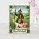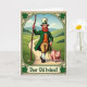This design shows a ruddy-faced man with a ginger beard striding down a winding dirt path, his emerald top hat marked with a shamrock and his long green coat swinging as he walks. He wears an orange waistcoat that warms the scene, and he grips a wooden staff while holding a golden leash in his other hand. At his side, a plump rosy-pink pig trots along, leaning in close as if it trusts him completely, adding a friendly, affectionate note 💚. Behind them, soft green hills roll into the distance under a clear blue sky with scattered white clouds, giving the whole setting an easy, open-air feel. An ornate vintage-style border wraps the illustration with shamrock motifs and cream flourishes, guiding your eye inward ☘️. Along the bottom, a banner carries the words “Dear Old Ireland!” in dark lettering against a light background, centered beneath the figures. The colors balance deep greens, warm orange accents, and the pig’s pink tone, all set against the pale cream border and bright sky. Fluffy clouds float above the hills while the shamrock-decorated frame curls at the corners around the scene.