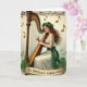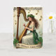 Designed with a serene Irish music scene, the card shows a graceful woman leaning close to a golden harp as if sharing a private song with someone just out of view 💚. Her auburn hair falls in soft waves beneath a wreath of green leaves, and her off‑white gown carries small gold accents that catch the light. An emerald sash tied in a neat bow wraps her waist, echoing the shamrocks tucked into the lower corners ☘️. The harp is rendered in warm wood tones with carved details and fine, shining strings, while her lowered eyes and careful hand position suggest a tender, unhurried moment. Across the pale background, tiny gold notes drift near a traditional music staff, adding motion without crowding the scene. The phrase “St Patrick’s Greeting” sits on a scroll banner along the bottom, with dark lettering set against the light parchment-like ribbon for easy reading. Soft gold notes float diagonally above her shoulder toward the upper right, fading into the light backdrop.