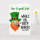 This card features a white background with a friendly leprechaun on the left, smiling wide with bright aqua eyes that seem to linger warmly as if he’s sharing a private joke with you 💚. His fiery orange beard and mustache frame rosy cheeks, and he wears an emerald green top hat with a black band, a gold buckle, and a small dark shamrock detail ☘️. A short dark blue pipe rests near his mouth, sending up a thin curl of grey smoke that drifts upward. On the right, the humor comes through in stacked text that feels like a lighthearted nudge between friends. Near the top, “how to speak Irish” appears in green lettering, centered above the larger phrase below. Under it, “WHALE OIL BEEF HOOKED” is set in black, all caps, taking up the most space, with “(say it fast)” in smaller black text beneath it. The leprechaun’s hat tilts slightly, and the smoke wisp rises in a soft curve beside his face.