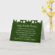 Cartão de bênção de aniversário inspiracional retrata um fundo verde escuro com shamrocks brancos. Apresenta a amada Bênção Irlandesa; "MAIO A ESTRADA se levanta para te conhecer. QUE O VENTO esteja sempre nas suas costas. QUE O SOL brilhe quente em seu rosto; as chuvas caem suaves em seus campos e até que nos reconheçamos, QUE DEUS O SEGURE na palma de Sua mão." A Bíblia Verse Jeremiah 29:11, "Porque eu sei os planos que tenho para você," declara o LORD, "planeja prosperar e não te machucar, planeja dar-lhe esperança e um futuro." *
