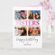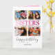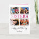 Cartão de aniversário irmão sibilante com uma colagem de 4 fotos, a palavra "irmãs" em uma fonte cintilante rosa giro, uma citação personalizada, um coração bonito e um nome.