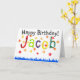A bright, colorful birthday card for a young man of any age named Jacob! The design is made from a handpainted paper collage and the inside is left blank for your own message. See also matching gifts and apparel.