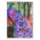 Procurando por um pavão exótico? nesta arte de pavão, um pavão azul roxo e safira senta-se em um toco de madeira em um lindo campo cheio de corais e flores silvestres rosa. As penas de Pavão são tons de flox e orquídea com muitos castanhos para complementar as cores ricas. O fundo tem também árvores castanhas áridas com verdes-de-dar-peludos e amarelos-de-bambu para além. Desenhada pela artista aquática Miriam Schulman