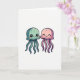 This design shows two cute, human-like jellyfish floating close together on a bright white background, as if they’ve drifted into a quiet moment just for each other 🥰. The jellyfish on the left is a calm teal-green with a rounded bell and flowing tentacles, dotted with tiny speckles that add texture. On the right, its partner is a soft blush-pink, matching the speckled pattern and trailing tendrils in a gentle, airy way ❤️. Both have oversized glossy black eyes, small curved smiles, and rosy cheeks that make their shared glance feel tender and friendly. A dark outline defines each shape and keeps the pair crisp against the open space. There’s no scenery around them, so the focus stays on their closeness and the way their tentacles seem to sway toward one another. No text appears anywhere on the front, leaving only the teal and pink characters centered with their speckled bells and dangling tentacles.