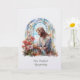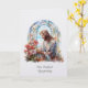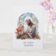 Este cartão de condolências personalizado e elegante apresenta uma imagem serena em vitral de Nosso Senhor Jesus admirando um delicado buquê de flores silvestres. Renderizado em tons pastéis suaves de azul, branco e rosa, a obra de arte evoca paz, esperança e lembrança suave em tempos de perda.