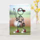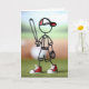 Um personagem em forma de palito vestido de jogador de beisebol está no gramado verde de um campo de beisebol segurando um taco e uma luva para o aniversário de beisebol.
