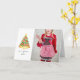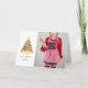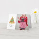 Ilustração de uma fatia de pizza em forma de árvore de Natal com toques vermelhos e verdes revestidos com uma estrela. Personalize o nome e o ano de dentro. Personalize as fotos na frente e no dentro.