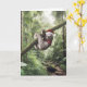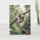 Uma preguiça vestindo um chapéu de Papai Noel vermelho e branco e um cachecol vermelho pendura confortavelmente de um galho no meio de uma floresta verde e luxuosa