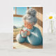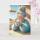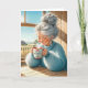 A luz do sol flui através de uma janela, iluminando uma mulher com cabelo de cinza num suéter azul aconchegante enquanto ela desfruta de uma bebida quente numa caneca chamada "Bom dia". O texto do dentro pode ser alterado.