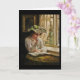 Victorian woman wearing a fashionable hat sits by a window reading. Looking through the window you can see soft pink roses. Fine art by Thomas Kinnington c1889.