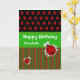 A modern birthday card design which you can personalize with your own text and the name of the recipient. The color scheme is red, green, black and white, and there are co-ordinating ladybugs and stripes patterns on the front. Type in the boxes to change the greeting on the front "Happy Birthday", the name, and the greeting inside "Ladybugs to bring you good fortune in the year ahead".