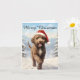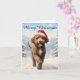 Design de um Lagotto Romagnolo vestindo um chapéu de Papai Noel andando pelas montanhas de neve e desejando Feliz Natal.