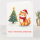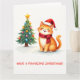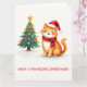 Uma bela cena de Natal com um adorável gatinho laranja vestindo um chapéu de Papai Noel e um cachecol vermelho sentados alegremente ao lado de uma árvore de Natal.