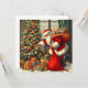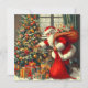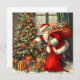 Cette image montre le Père Noël en train de déposer un cadeau sous un sapin de Noël décoré. Le sapin est orné de boules, de guirlandes et d’une étoile. Il y a d’autres cadeaux emballés sous le sapin. Le Père Noël porte un grand sac rouge sur son épaule, rempli de plus de cadeaux. À l’arrière-plan, on voit une fenêtre avec un paysage enneigé. L’image dégage une ambiance festive et joyeuse.