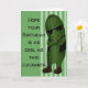 Diversão do cartão de aniversário para as pessoas legal da sua vida. À direita do cartão está um pepino verde vestindo tons escuros, um colete preto e botas marrons. Ele está em pé com braços dobrados e um sorriso atrevido. No lado esquerdo, em letras negras, diz-se "Espero que o seu aniversário seja tão legal como este pepino". O fundo é verde com listras verdes claras.