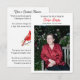Um cartão personalizado onde você pode adicionar a foto de uma pessoa, nome e datas de nascimento e morte. No verso, há um poema sobre os cardeais que vêm visitá-lo quando um ente querido está perto, deixando claro que eles nunca estão verdadeiramente perdidos. Este cartão tem alguns acentos vermelhos para combinar com o cardeal. São ótimos para colocar em mesas em celebrações ou funerais para que a família e amigos do ente querido levem para casa.