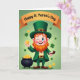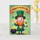 This card shows a cheerful leprechaun standing front and center in an emerald green suit and tall hat with a gold buckle, giving a friendly wink that feels like he’s sharing a secret with you 💚. His bright orange beard frames rosy cheeks and a wide smile, adding a cozy, buddy-like warmth to the scene. The background is a soft green gradient that glows behind him, with small shamrocks drifting around like confetti ☘️. Gold coins are scattered through the air, and a dark pot to his left is packed with more coins, making the whole setting feel lucky and lively. In his right hand he holds up one large gold coin as if offering it to a friend, while his left hand rests on a brown pipe. Near the top, an amber banner stretches across the card with the words “Happy St. Patrick’s Day” printed clearly in a darker contrasting tone. The banner sits above the leprechaun’s hat, and the shamrocks and coins continue to float around the green backdrop.