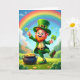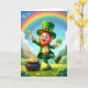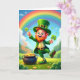 This card shows a cheerful leprechaun front and center, smiling wide with bright green eyes and a ginger beard, as if he’s sharing a lucky secret with a close friend 💚. He wears head-to-toe green, from a tall hat with a buckle to striped socks and shiny shoes, and he lifts one foot as though mid-step on the grass. In each hand he holds a four-leaf clover, and one hand adds a thumbs-up that feels like a friendly wink ☘️. Behind him, a rainbow stretches across a blue sky with soft clouds, arching over rolling green hills. Near his feet sits a black pot tipped with gold coins, with a few coins scattered onto the ground among small shamrocks. The main greeting text sits near the top in green lettering against the sky, easy to spot above the rainbow. The gold coins are drawn with smooth highlights, and the rainbow bands curve clearly from one hill to the other.