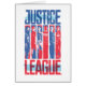 Este gráfico patriótico da Liga da Justiça é pintado em azul e vermelho, os membros da Liga se posaram em faixas de cores alternadas entre o logotipo do filme da Liga da Justiça.