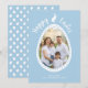 Personalizable photo template card designed for Easter by Destei. Your photo is placed inside an Easter egg shape with a white border and light blue dots. The top of the egg reads “Happy Easter,” separated by a cute bunny silhouette with space at the bottom for a name and year. The text appears in white on a light blue background and both colors can be changed if desired. On the back, a pattern of tiny Easter eggs creates a playful polka dot effect. A whimsical and festive design for sending Easter greetings.