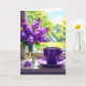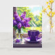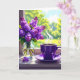Um lindo cartão de aniversário floral para a sua filha. Uma bela ilustração ai de um vaso de lilases roxas num vaso de vidro e uma xícara de café quente sentados numa ladeira de janela.