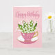 Uma pequena e tênue teacup rosa cheia de um belo monte de lírios das flores do vale junto com as palavras escritas pela mão Feliz Aniversário no topo da carta e as palavras 79 escritas hoje com corações amorosos na xícara de chá. Um doce cartão de aniversário para alguém especial fazendo 79 anos hoje!
