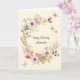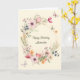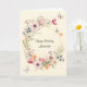 Uma bela coroa floral com flores cor-de-rosa, laranja e azul envolve uma saudação de aniversário enquanto duas borboletas bonito voam por perto.