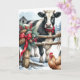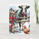 Bonito vaca branca e negra com um arco vermelho e um galo fofo. O fundo tem um celeiro rústico vermelho e uma cerca de madeira decorada na terra de Natal. Uma bonito cena aquática de um dia de inverno nevado na fazenda. A parte traseira do cartão pode ser personalizada com seus próprios cartões de natal e nomes de família.