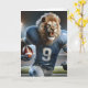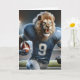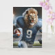Um leão em um uniforme de futebol 9 cobra pela frente em um campo iluminado, segurando uma bola de futebol com determinação e energia. O texto do dentro pode ser alterado.