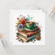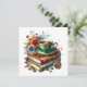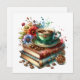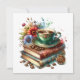 Cartão em branco. Pilha de livros antigos, lindas flores e uma xícara de café quente em uma xícara de chá antiga.