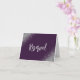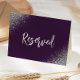 Este elegante e moderno cartão de lugar reservado para mesa de casamento apresenta falso brilho prateado em cantos opostos. A palavra "Reserved" aparece em escrita manual prateada sobre fundo roxo escuro em ambos os lados do cartão.