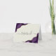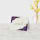 Este elegante cartão de lugar reservado para mesa de casamento moderno apresenta uma imagem de agata púrpura, aparada com brilho dourado em cantos opostos. A palavra "reservado" aparece no guião de escrita de cinzas de carvão com baloiços antes e depois num fundo de marfim em ambos os lados do cartão.